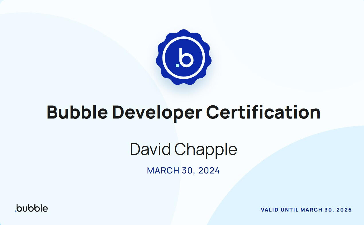 I’m David Chapple, a former Senior Microsoft Consultant and freelance developer, and for the past eight years I’ve been building reliable and responsive applications with Bubble.io. I really enjoy building applications and helping businesses to automate and I have been doing it before the days of Bubble.io.Bubble is the leading 'no-code' applications generator and full-stack platform. It gives you everything in one place, from drag-and-drop development to secure hosting, so your system can grow and adapt as your business does. No more being held hostage by impenetrable complexity. With Bubble you get:+ Accessibility: you and your team can understand and manage the system